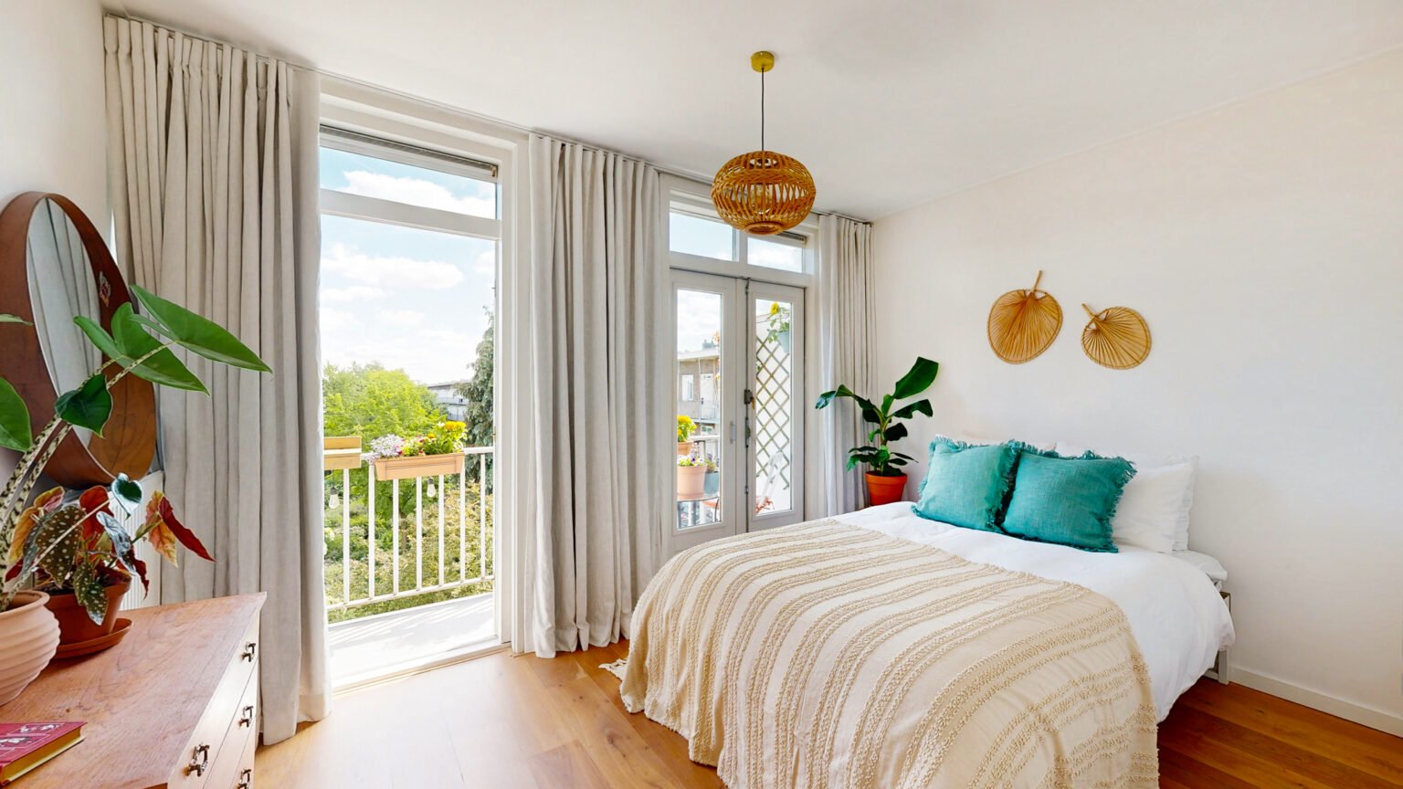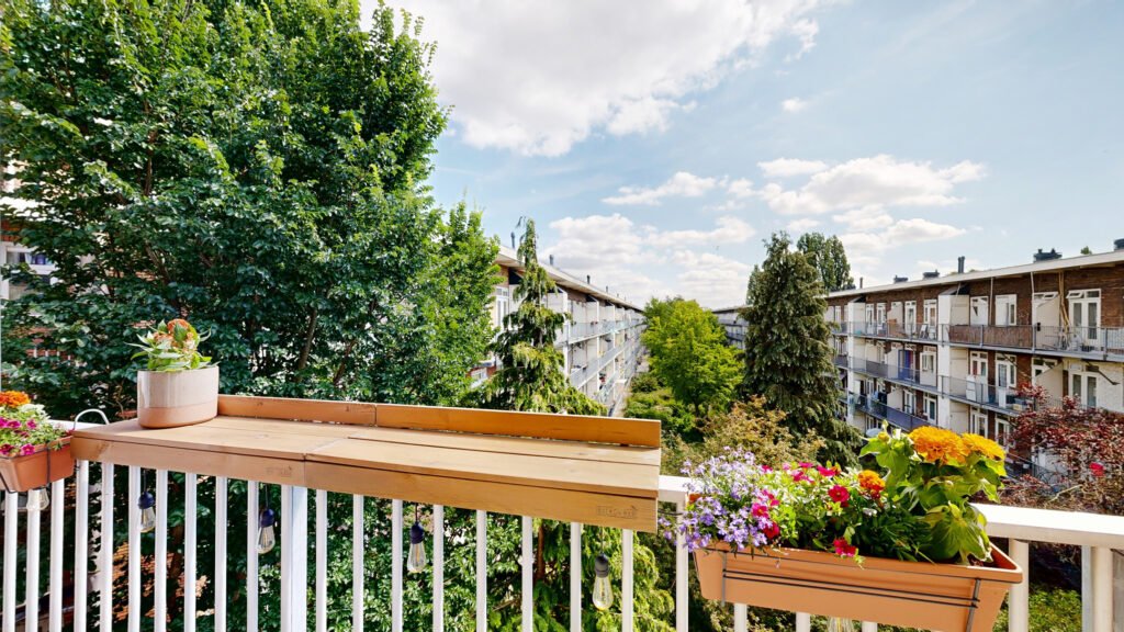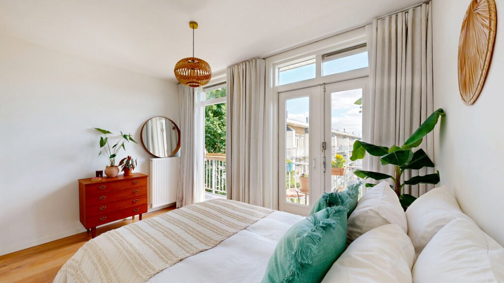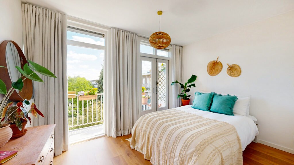De slaapkamer is verrassend ruim en heeft directe toegang tot het balkon op het zuiden. Dankzij de ligging op de derde verdieping en het vrije uitzicht aan de achterzijde voelt het heerlijk licht en open. Het balkon is een verlengstuk van de woning en biedt ruimte voor een zitje, planten én extra opbergruimte in de balkonkast.