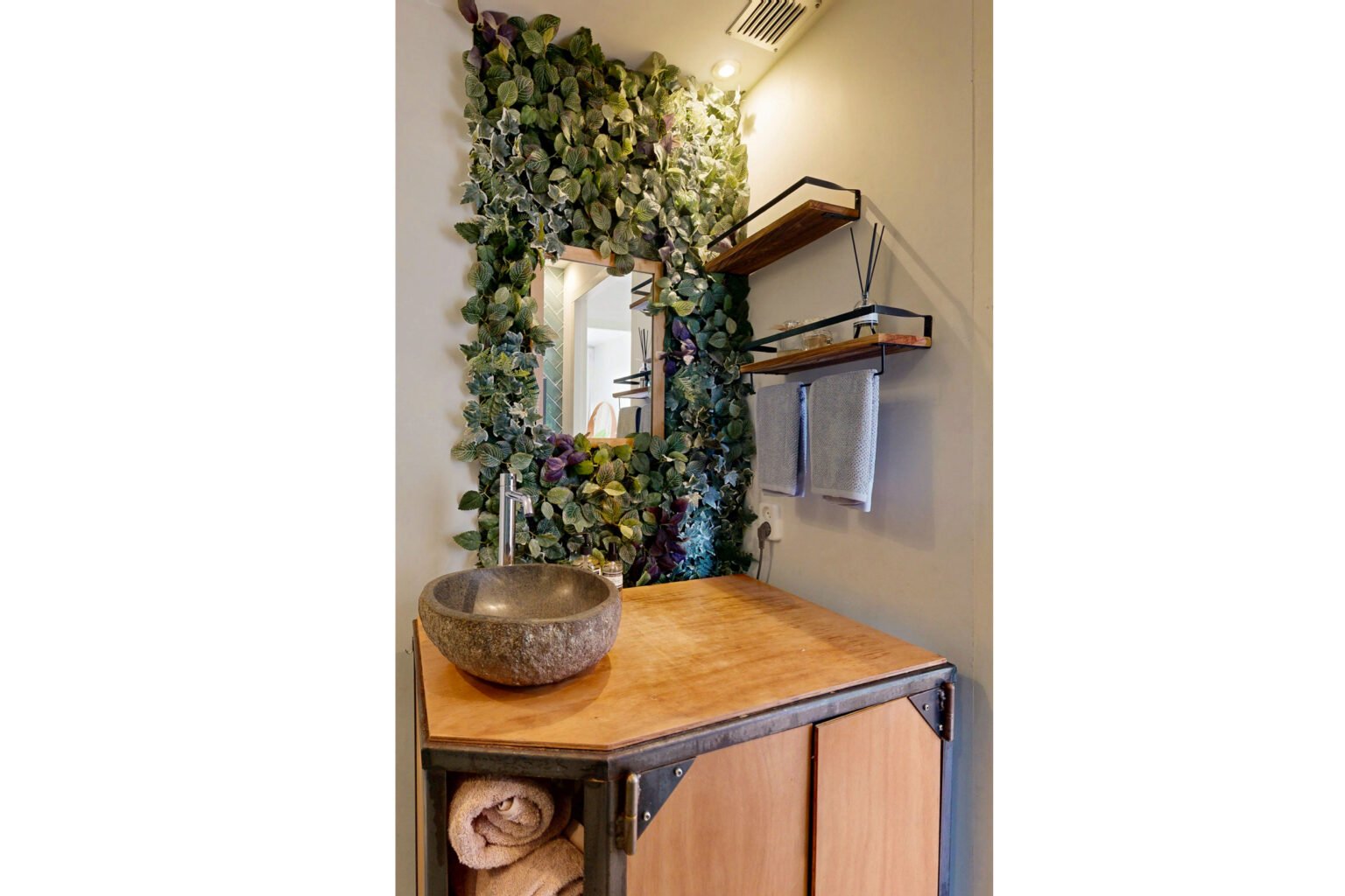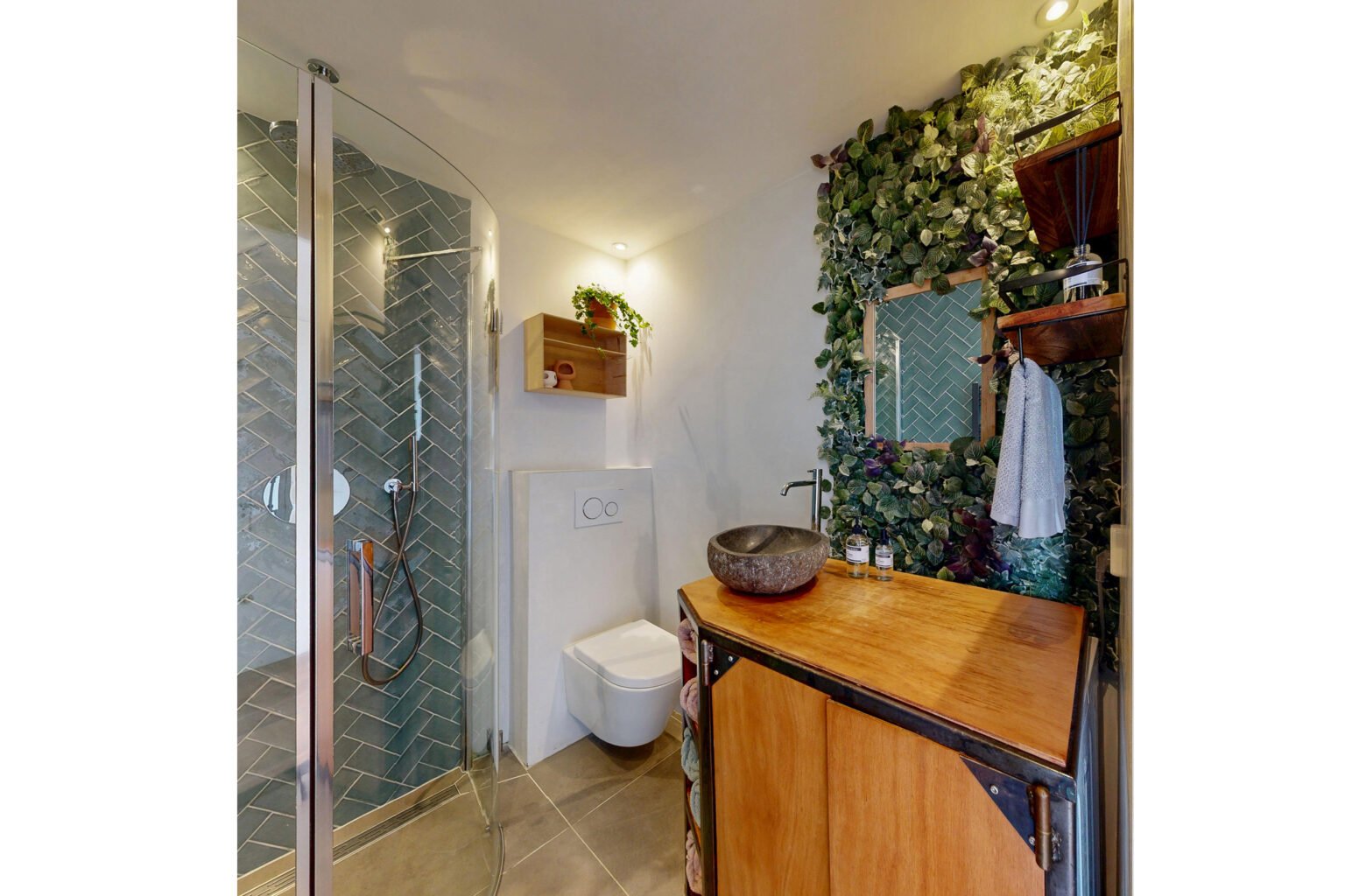 De leuke badkamer is netjes en slim ingedeeld, met een douche, wastafelmeubel, toilet en een ingebouwde was-droogcombinatie. Inbouwspotjes zorgen ook hier voor een moderne uitstraling.