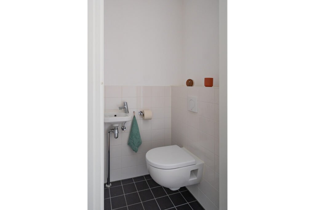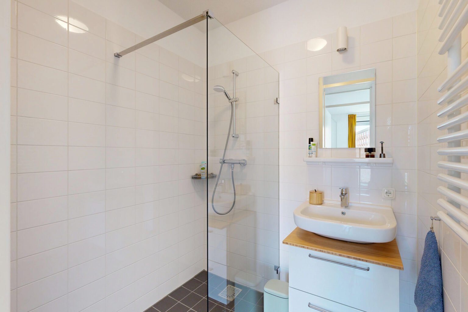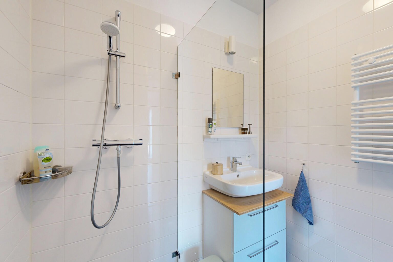 Je kan zowel met de lift als met de trap naar de vierde en bovenste verdieping. Bij binnenkomst kom je in de hal met aan de linkerzijde de fijne badkamer. De badkamer beschikt over een prettige inloopdouche, een wastafelmeubel en een handdoekradiator. Het toilet is separaat.